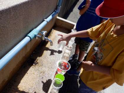 かさくらべをしました。どちらがどれだけ多いか、同じ大きさのカップを使って調べました。小さい容器を持ってきていた人は、ペットボトルのキャップでいくつ分かを調べていて、自分たちで工夫して学習している姿が素晴らしかったです。