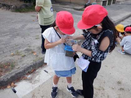 最後は、生活科でやっている「虫見つけ」に行きました。短時間なだけに必死に頑張っていました。みんなで頭を寄せ合っている姿は本当に可愛いですね。