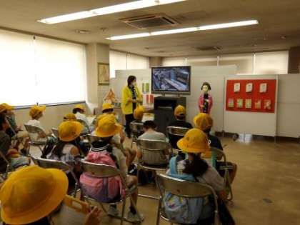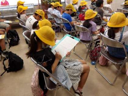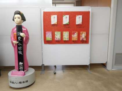実際に見ることができない生地作りのところをビデオで見ました。メモするところが無くなるくらいたくさん聞くことができましたね!ビデオを見る部屋には「祥豊小学校」の札を持った夕子さんが!