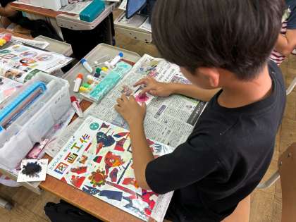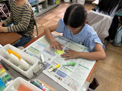 小さな紙の上で、絵具をゆっくり混ぜてみます。