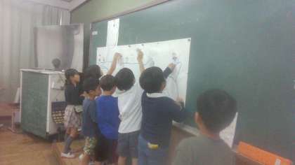 くじらぐもに乗った子どもたちが、どんなお話をしたかを想像しました。くじらぐものどこに乗るか、みんな思い思いの場所に乗りました。「ふわふわ。」「きもちいい。」「ぼくの家が見える。」「ジャンプしようよ。」と、楽しく考えることができました。