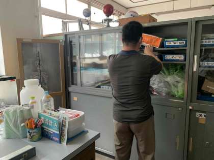 理科準備室をのぞくと、授業の合間に