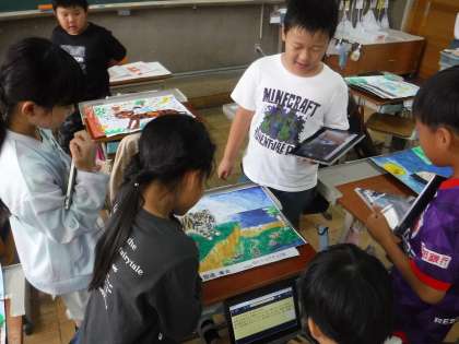 お話の絵の鑑賞会をしました。どちらのクラスの作品もじっくり見て、お気に入りの写真を撮り、どんな所が良かったのかロイロノートに書き込みます。みんなお友だちの素敵な作品を嬉しそうに見ていました。