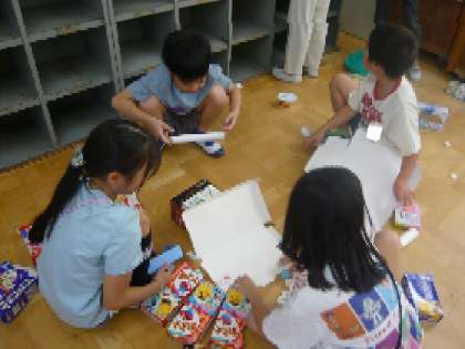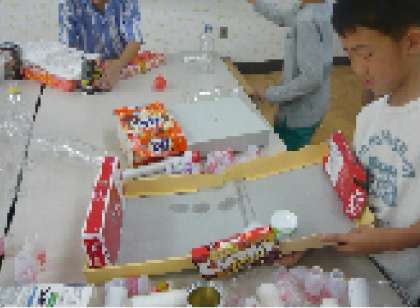 「ペットボトルのふたに穴をあけてタイヤにしたよ!」