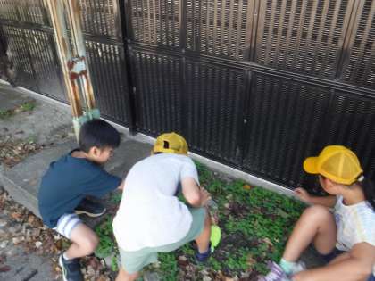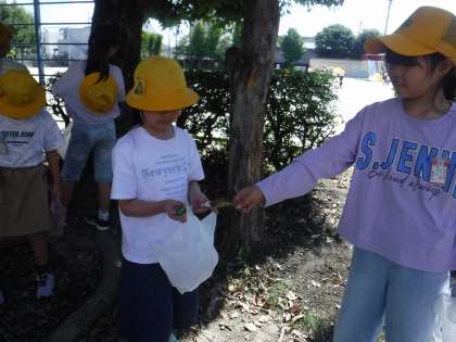 自分のお気に入りの葉を探しに運動場へ。緑色の葉っぱや黄色くなった葉っぱ、模様のある葉っぱなど、いろいろな葉を見つけていました。見つけた葉の色や形を観察して、画用紙に貼っていこうと思います。