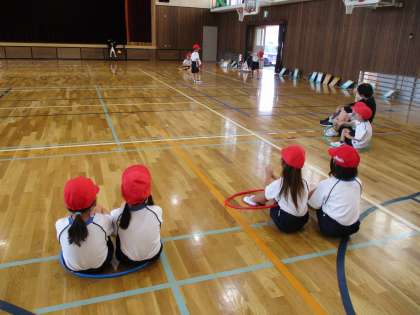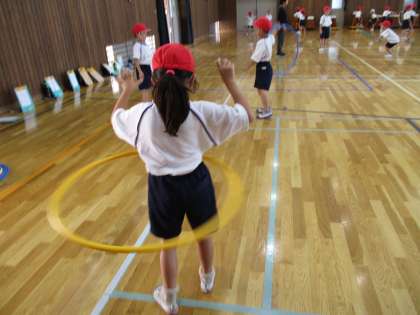 「ようぐあそび」の学習で、今日はフープを使いました。手で回したり、腰で回したり、縄跳びのように跳んでみたりして楽しみました。友達の発表もよい姿勢で聞いていて、素晴らしいです。来週の体育も楽しみです。