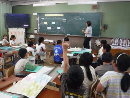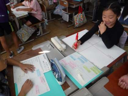 今日は、公園にあったらいいなと思うものを交流しました。グループでまとめて全体で話し合う時には、噴水のある公園、かまどベンチのある公園、植物のある公園、などたくさんの意見が出てきました。こんな公園があったら、祥豊の町は素敵な町、楽しい町、みんなが来たくなる町になるという考えも伝えてくれました。「公園をつくってみたい!」という発言から、じゃあ次はどんな公園にしたいのか?を考えていくようです。