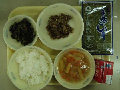 今日のメインディッシュはご飯と肉みそ納豆を、各自手巻きのりで巻いて食べるというものでした。