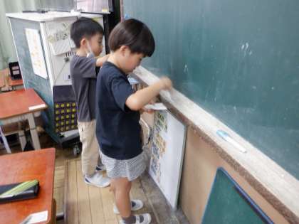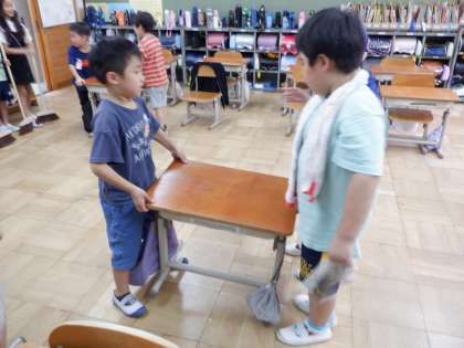 連休明けは疲れが出やすい人もいるのですが、今日の最後の掃除は、とっても丁寧にがんばっていました!黒板の溝をよく見てミニほうきで履いていた莉、ぞうきんもギュッとしっかりしぼっったりしていました。