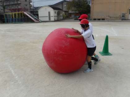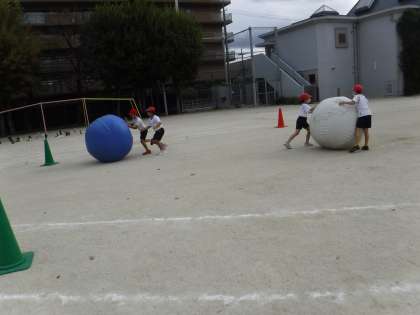 大玉を転がしている子どもたちは、笑顔いっぱいです。友だちと2人で協力して転がすことが楽しいようで、見ているこちらも笑顔になります。本番も楽しんで転がしましょう!!