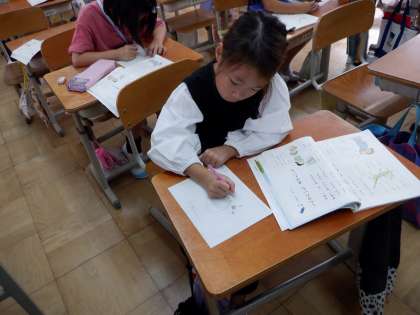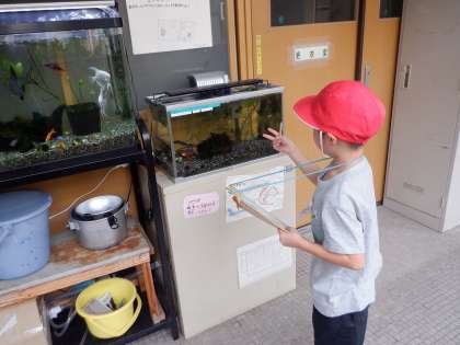 学校にいる生き物を家の人に知らせる学習です。知らせたいものの絵を描きました。中庭のコイが大人気でした!