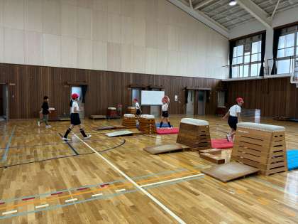 今日は、準備をしてから、ねらい1「自分のできるとびこし方で高さや向き、ふみ切り板の距離の違う跳び箱に挑戦する」にチャレンジしました。