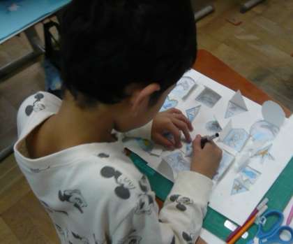 今日は、窓を開けた画用紙を折ったり切ったりして