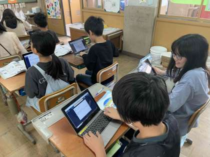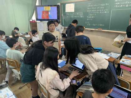 5年生が実験の進め方を確認しています。