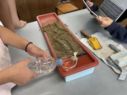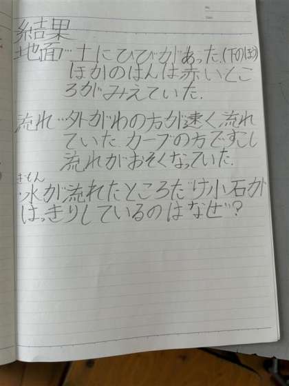 流れる水がどのような働きをするのか、予想を立てて実験しました。カーブの内側、外側に注目して考えることができました。新しく出た疑問を次回以降解決していきます。