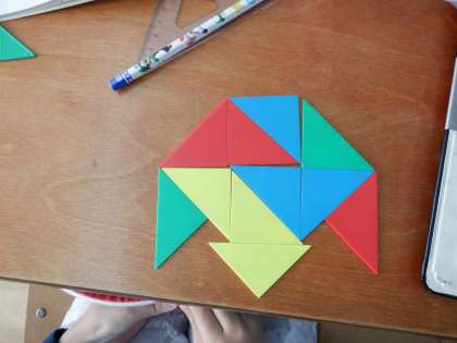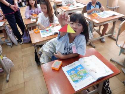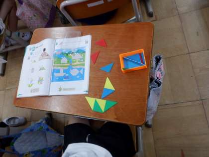 三角の色板2枚でどんな形ができるかを見つけたり、並べ方を考えていろいろな形をつくったりしました。「できた!」と、どんどん手をあげて、つくった形を見せてくれました。やる気いっぱいの姿が素敵でした。