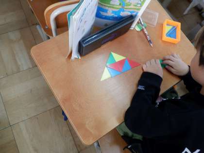 今日の算数は、影絵を線で区切り、色板が何枚必要か調べて、並べ方をかんがえました。