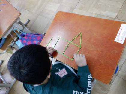棒を使って形をつくる勉強の復習もしました。教科書と同じ形を作るだけでなく、自分で考えた形も楽しんで作っていました。