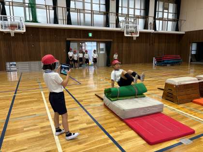 準備も慣れた手つきで、子どもたち同士で素早く動くことができてきました。ねらい2で、できそうな技を練習する際には、GIGA端末を活用し、自分の分析ができる子も増えてきました。