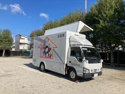 写真は、地震の揺れを体験する起震車での様子です。
