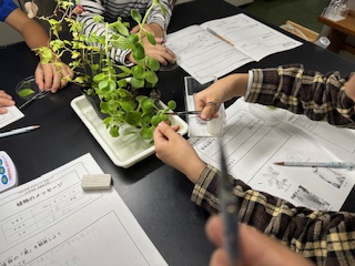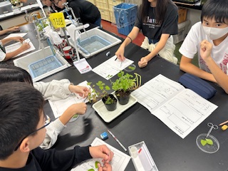 レモンバームとアロマティカスの葉を観察しています。
