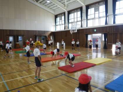 今日は最後のマット運動でした。連続技を一人ずつ見せてもらいました。1時間目と比べ、ずいぶん上達した姿に一生懸命練習したことが伝わります。「上手にできなかった〜。」と残念がる子もいますが、先生たちからしたら前向きに取り組み、自分のめあてに向かって頑張る姿が見ることができて嬉しかったです。次は「はばとび」ですね。