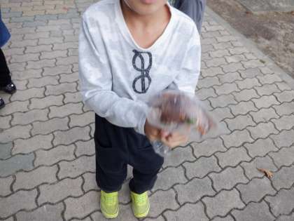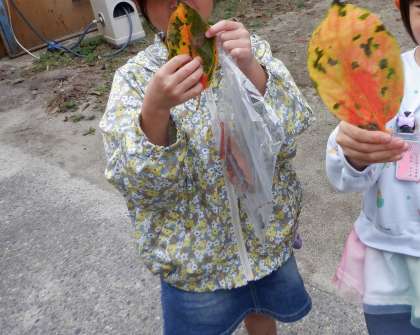 今日は、秋の物を使ってどんなものがつくれるかな、とみんなで考えた後に、校内を回って落ち葉や木の枝を見つけに行きました。柿の葉の落ち葉がきれいに染まっていました。また、集めた落ち葉をビニールに入れてふると、シャカシャカ音がするよ、と教えてくれました。