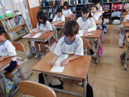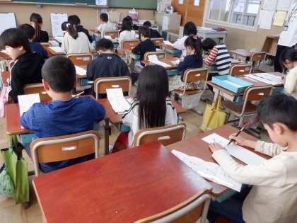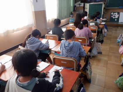 今日から書初め展に向けて、書初めの練習を始めました。1年生になって初めてフェルトペンを使っての学習です。大きな紙に大きな字を書くので、姿勢をよくすることが大切になってきます。良い姿勢で慎重に書いていました!来週は、清書をします。