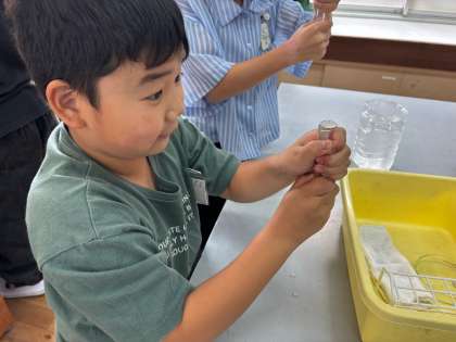 せっけん水をひたした1円玉を試験管の上に置き、試験管の中の空気を両手で温めました。
