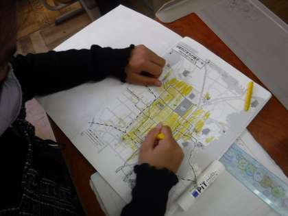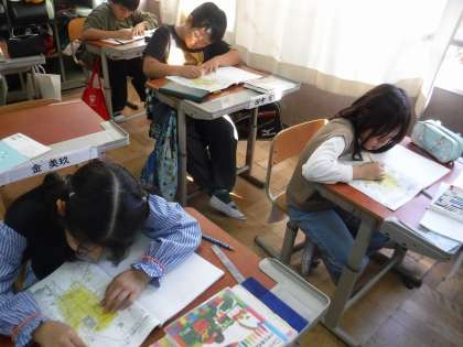 大正時代から昭和時代、令和時代の地図で市街地がある場所に色をぬりました。どんな風に京都の町が広がっていったのか次の時間に話し合います。
