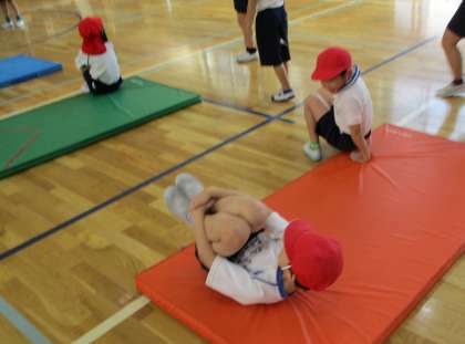 今日から「マットあそび」の学習がはじまりました。背中を丸めてゆらゆらさせる「ゆりかご」をやってみました。「ゆりかご」は、毎時間の初めに体慣らしで行うので、どんどん上達すると思います。