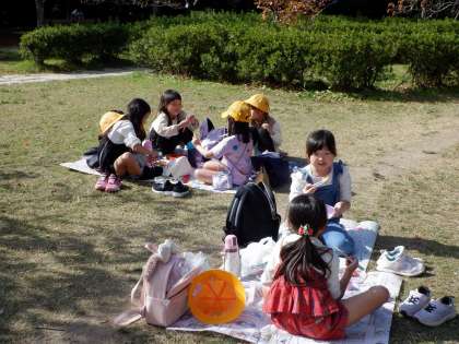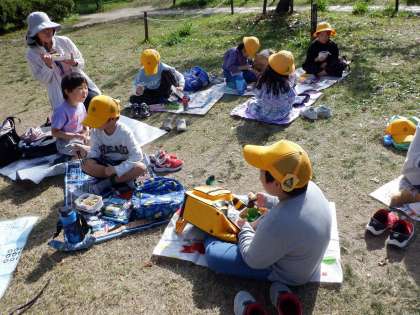 「おなかすいた〜。」お待ちかねのお弁当の時間です。梅小路公園に着いた直後から「お弁当まだ?」と言っていた人もいました。「見て見てー!」「○○入ってるよ!」みんな笑顔でした!晴れた空の下で、愛情たっぷりのお弁当が食べられて幸せでした☆