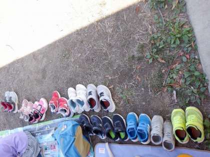 お弁当の後、レジャーシートをつなげてゴロゴロくつろいでいる人もいました。帰り道に向けて、エネルギーを充電中です。玄関も決まっていて、くつをきっちりそろえているのも素敵でした!