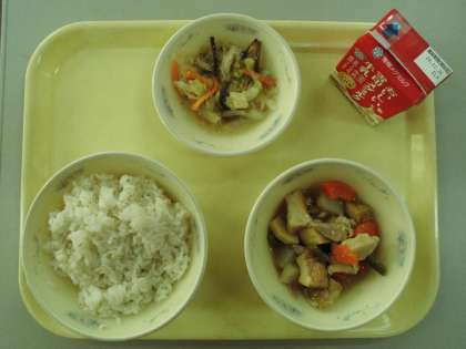本日の給食では厚あげ・鶏肉・こんにゃく・にんじん・たけのこ・しいたけなど、見た目にも色鮮やかな食材が多く使用されていました。