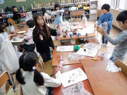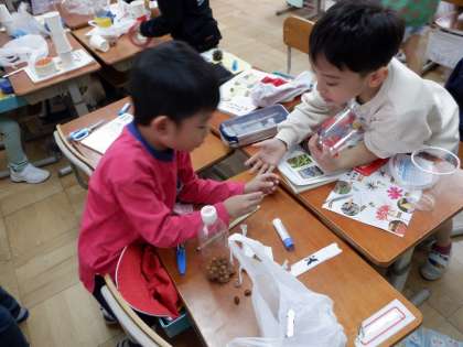 校外学習を終えてどんぐりがたくさん手に入ったので、秋の物を使っておもちゃをつくりました。まえの時間に、必要な材料を調べていたので、今日はどんどん作って楽しみました。自分たちであれこれ工夫しながら作業を進められていて素敵でした。
