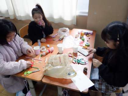 楽しい「あきまつり」に向けて、準備をしているところです。どんぐりを使った「でんでんだいご」や「どんぐりごま」のグループ、まつぼっくりを使った「けんだま」や「かざりづくり」のチーム、それぞれのグループで2年生や3年生にも楽しんでもらえるものをつくりました。