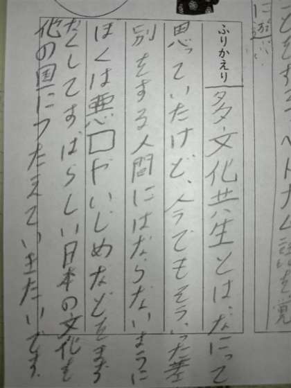 今日は、身近にある多文化について学習しました。外国人だからというわけではなく、普段からお互いを尊重しあうことの大切さに気付くことができました。