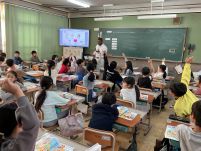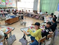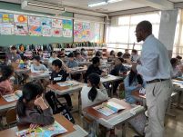 ALTの先生に来てもらって、形や身の回りの物の言い方を確かめました。その後の給食も一緒に食べました。英語で話しかけられると恥ずかしそうにしていましたが、ALTの先生との会話を楽しみました。