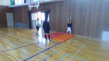 バスケットボールと並行して、マット運動を行っています。今日と次の時間で動画を撮影し、提出します。良いパフォーマンスが撮影できるまで、繰り返し練習します。