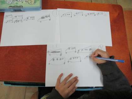 ひきざん(2)の学習も終わりが近づいてきました。今日は、計算の紙芝居を作りました。どんなお話にしようかなと頭をひねる子どもたち。できた紙芝居は、友達に聞かせて、満足そうでした。