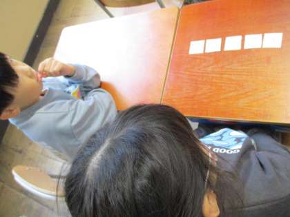 ひきざん(2)の学習も最後となりました。今日は、かずあてゲームをしました。数のカードなどを並べて、裏返しているカードの数を当てます。なかなか難しかったのですが、二人組で楽しんでいました。