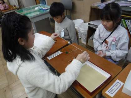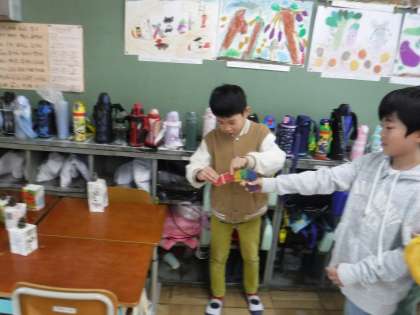中間休みに1年生の教室に遊びに行かせてもらいました。1年生の子たちは「秋みつけ」で見つけたものを使ってお人形やおもちゃなどを上手に作っていて、一緒にお話したり遊んだりして楽しい時間を過ごしました。
