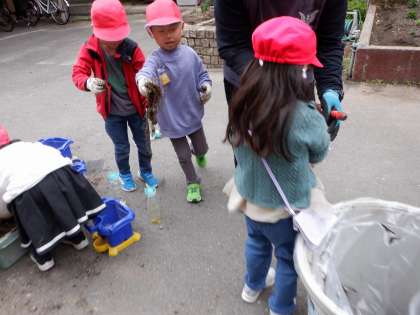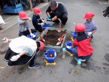 アサガオの根っこはとても長かったです。「土、半分って、これくらいかな?」楽しく会話をしながら作業していました。