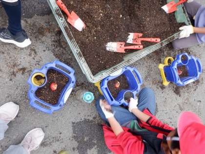 チューリップの球根は、おみくじで引いて、何色が咲くかはお楽しみ♪球根を真ん中に入れて、最後に土をかぶせました。水やりの仕方も教えてもらいました。今日はたくさんの先生が手助けしてくれました。最後にしっかり「ありがとうございました!」のお礼も言えましたね。