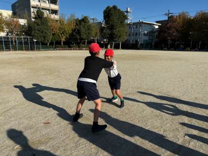 どうしたら、相手を円の外に出すことができるのか、子どもたちは、戦いながら考えていました。