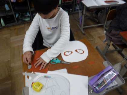 画用紙を使って「鬼の顔」を作っています。顔の形や目の形、まゆげなど、みんなそれぞれで、どんな鬼ができるのか楽しみです。