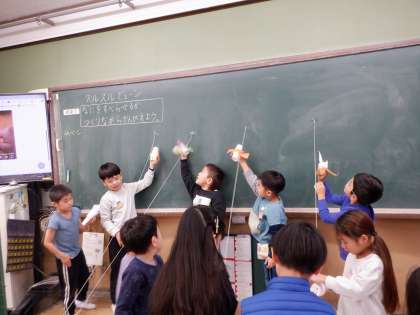 紙コップや紙皿にクリップをつけてタコ糸に引っ掛けると、スルスルすべるおもちゃができます。自分が滑らせたいものを考えて、思い思いの作品をつくりました。マジックを使ったり紙テープやスズランテープを使ったり、あれこれ楽しく作ることができました!