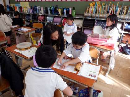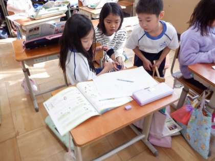 いくつかの絵を見て、思い浮かべた音を組み合わせて音楽づくりをしています。3人組で、それぞれお気に入りの楽器を使って音をつなげていきます。いろいろな音楽ができました!
