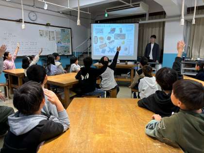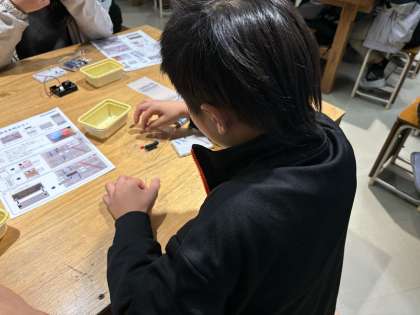 工房学習では、「株式会社SCREENホールディングス」の方々に半導体作りを体験しました。半導体とは何か、簡単な説明のあと実際に半導体でLEDを点ける装置を作りました。