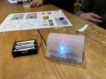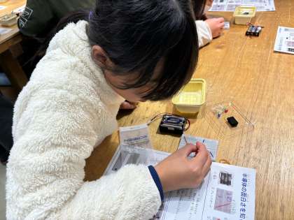 完成した装置のスイッチを押すと、イルミネーションのように光ります。信号が点滅するように、LEDが点滅している仕組みを作ることができることに喜ぶ子どもたち。